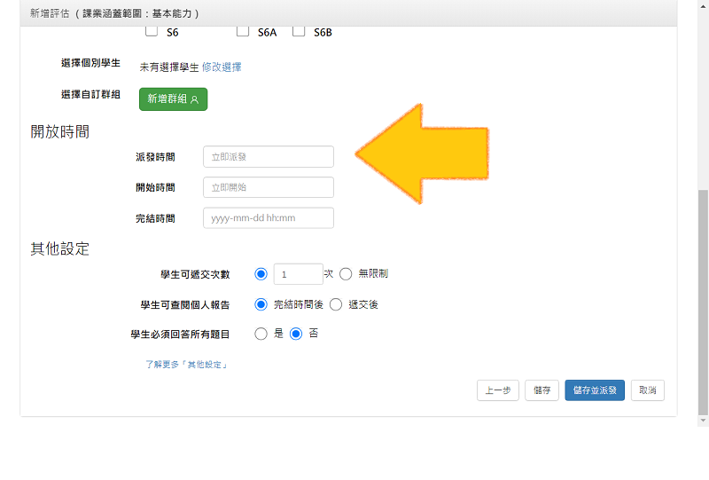 製作評估時,教師可額外設定評估派發時間。評估將於派發時間後才顯示於學生的評估列表。設定派發時間為教師提供更大彈性,讓評估適時提供給學生。