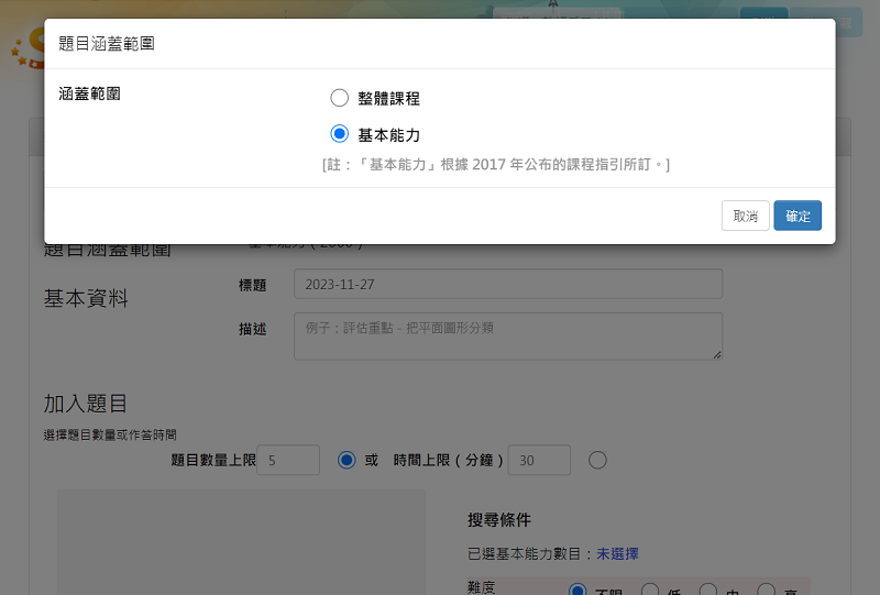 題目涵蓋的範圍選項:「整體課程」及「基本能力」