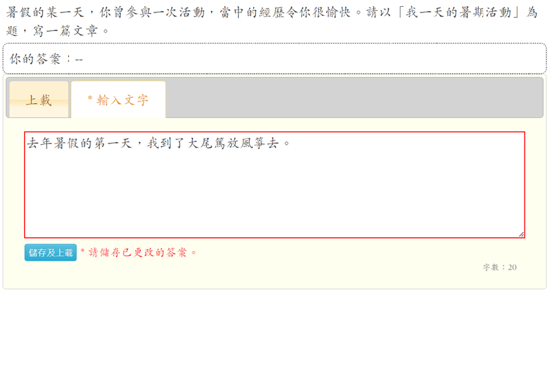 當學生作答寫作課業時,在「輸入文字」欄內加入純文字時,系統將顯示字數供學生參考。