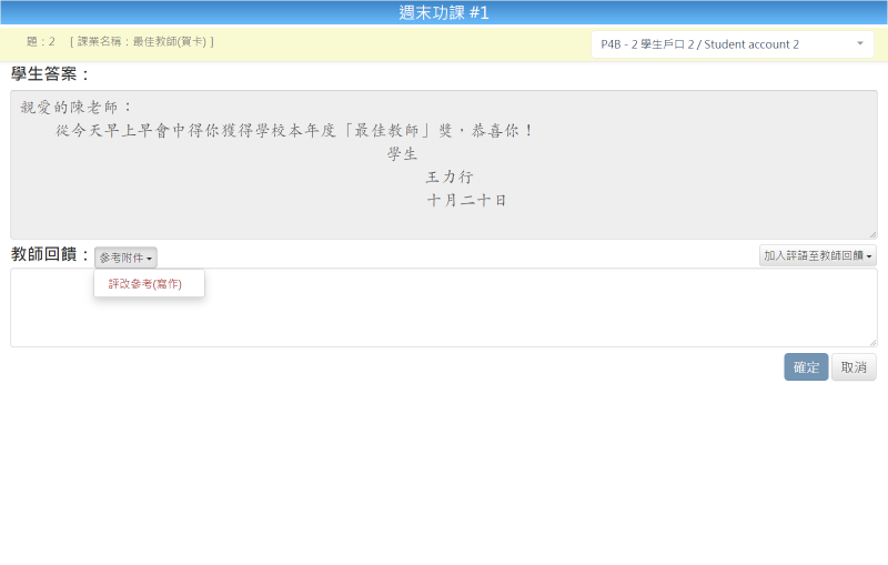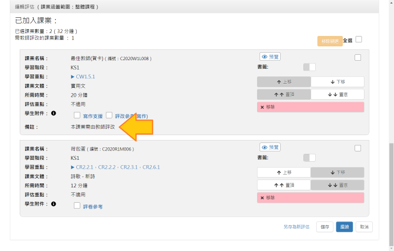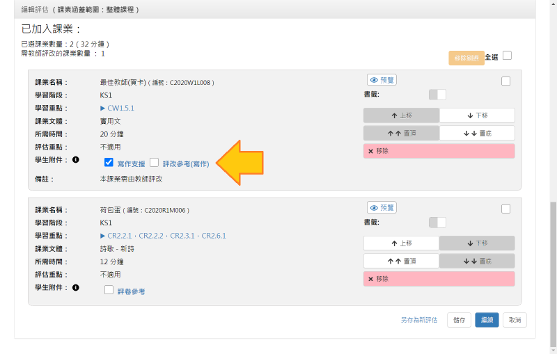 (教師製作評估時) 加入課業後,指定附件為學生附件