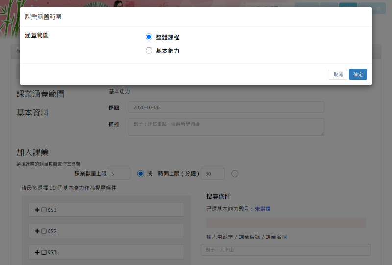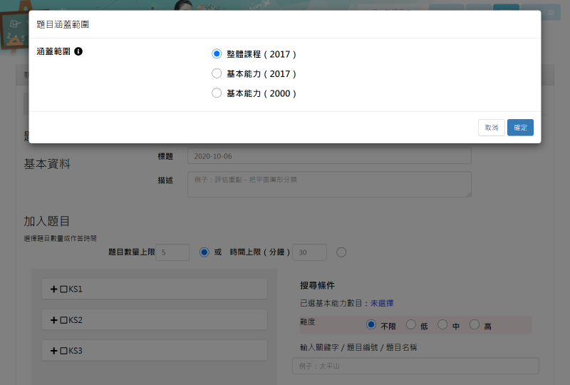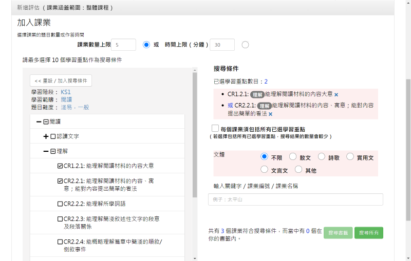 教師於新增評估時,必須先選定課業或題目涵蓋的範圍: