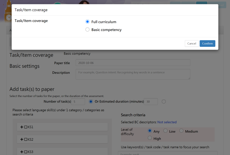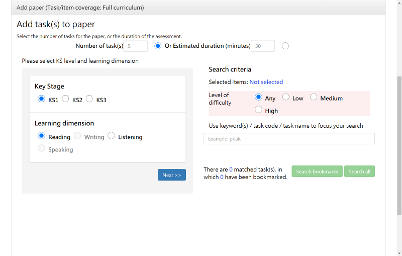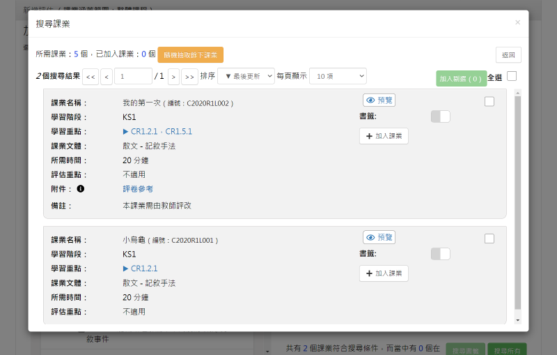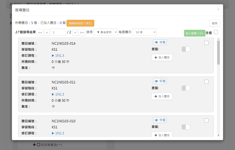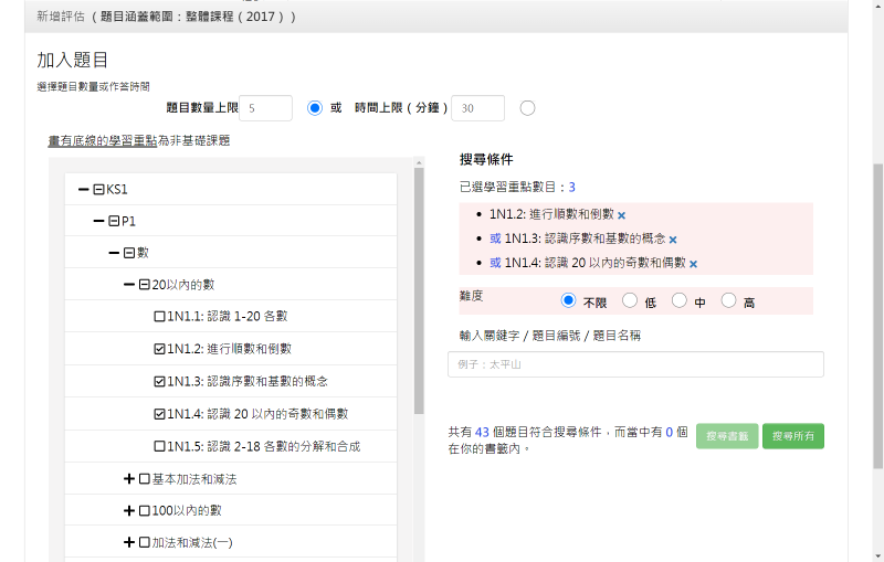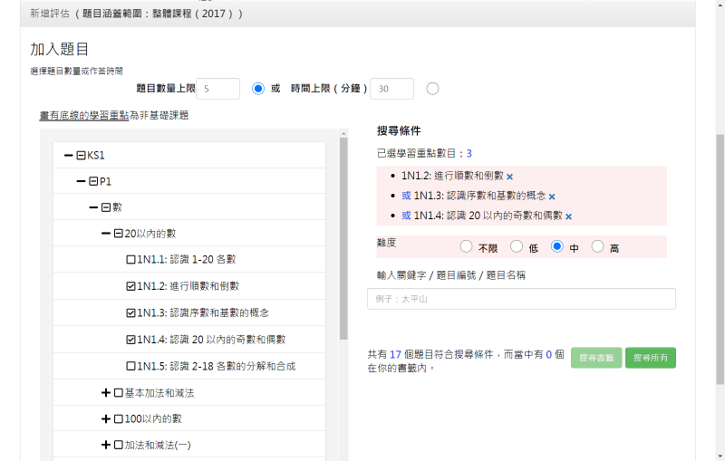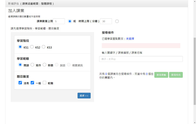 以基本能力為本製作評估的步驟維持不變。若教師選擇建立以課程為本的題庫,可按以下方式搜尋課業或題目,製作評估的其他步驟維持不變。
