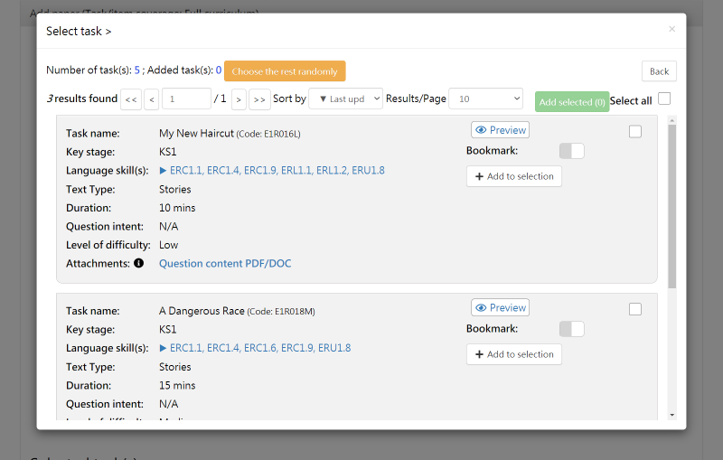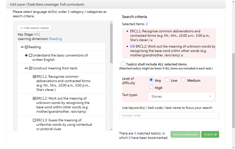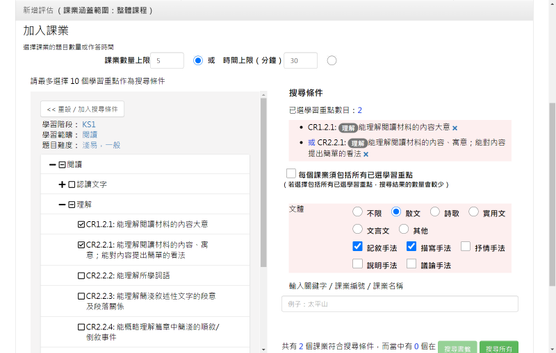 - 可訂明其他搜尋條件如文體(適用於「閱讀」)或語言(適用於聆聽)收窄搜尋範圍