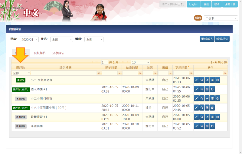 每份評估亦會標示評估是否需要評改及有沒有學生作業待評