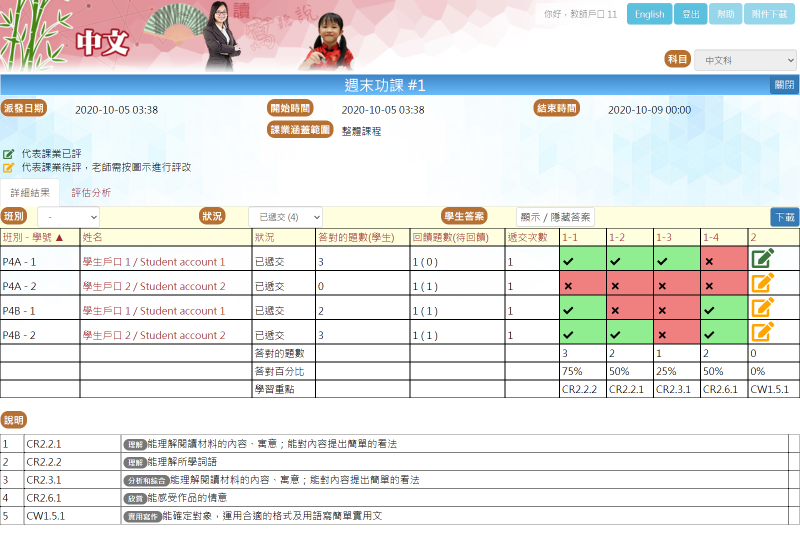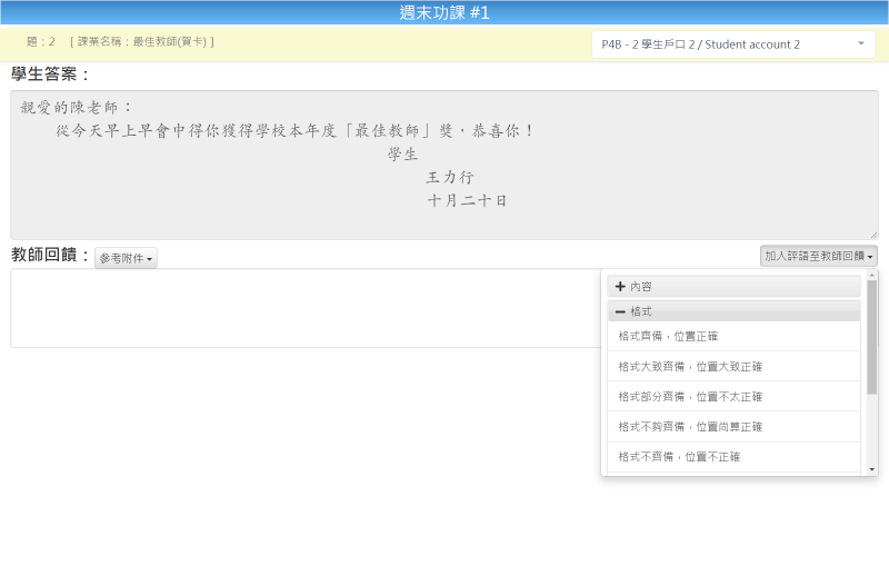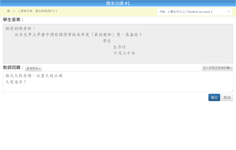 在教師報告中,需評改題目會以圖顯示—綠色代表已評,橙色代表待評。按圖示可檢示學生答案,再按「教師回饋」可進入評改版面,輸入/選取評語。