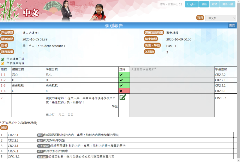 學生可於個人報告按需評改圖示(與教師報告一樣)檢視已遞交答案及教師回饋。